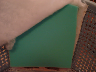 Next layer was a 1″ deep piece of foam cut to fit inside the layers. Another thin layer of batting over that and a few more staples.