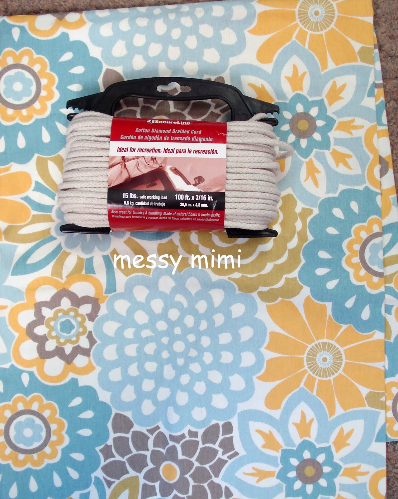 There were so many fabrics and colors I loved but in the end it had to be something that could work with the cane siding. There was a polka dot fabric and a Chevron one that I adored but, it wasn’t happening – too much pattern and I don’t want anyone getting dizzy looking at my chair! So… I decided to use the Waverly Button Blooms fabric I bought earlier and love so much. It is pictured with the cotton clothes line I found cheap at Walmart to make cording for the chair.