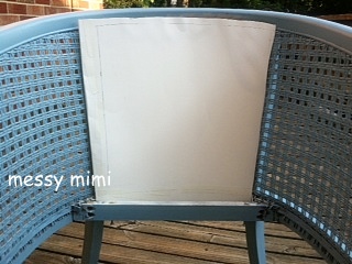 Now, on to the back of the chair.  I had traced a pattern onto some poster board for the back fabric panels.  I cut out 2 pieces for the front and back.  I pinned the back with the right side facing out