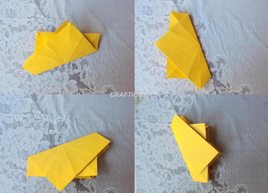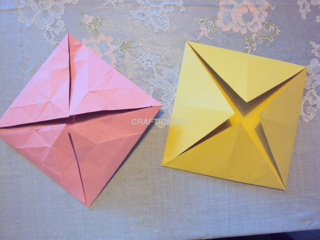 - Now place the two papers over each other such that pink is the diamond and the yellow is the square. Fold the yellow flap over so that it’s tip meets the tip of the pink paper. Repeat it with the other 3 sides. Repeat the process with the pink paper over the yellow paper now.