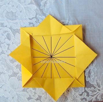 - Now we will need 8 pre-creased lines for the final jasmine flower. Fold the paper into triangles, rectangles and crosses. Make the lines stiffer with your finger tips (you can also use paper crease tool).